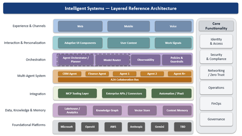 At the center of this model is a layered reference architecture that spans experience, orchestration, agent systems, integration, data, and platforms, with enterprise foundations applied across the entire stack.